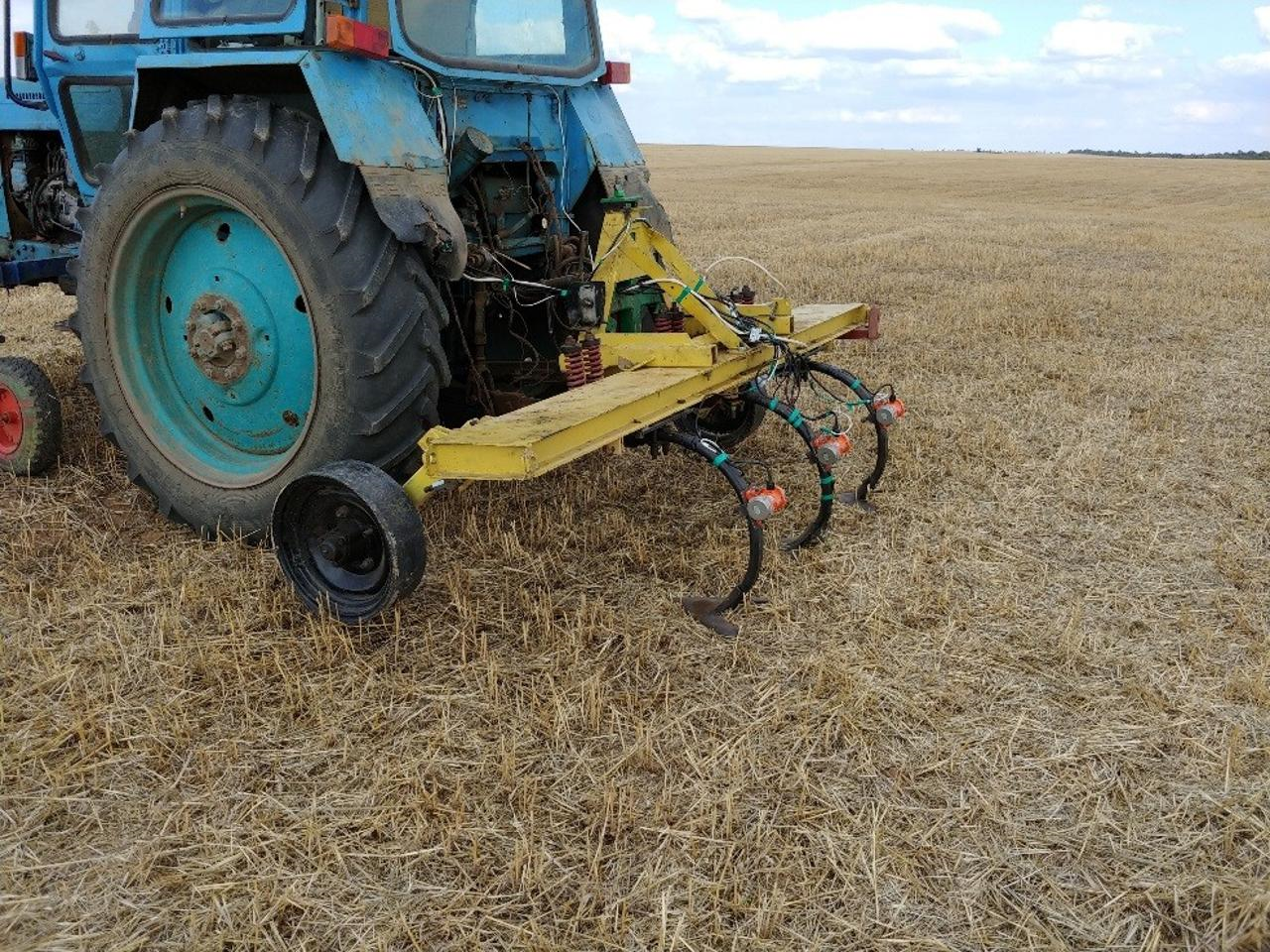 Результаты: Изготовлен опытный образец устройства с потребляемой мощностью до 13 Вт. Проведенные полевые испытания показали снижение тягового сопротивления МТА на 14,5%, с выполнением всех агротехнических требований.